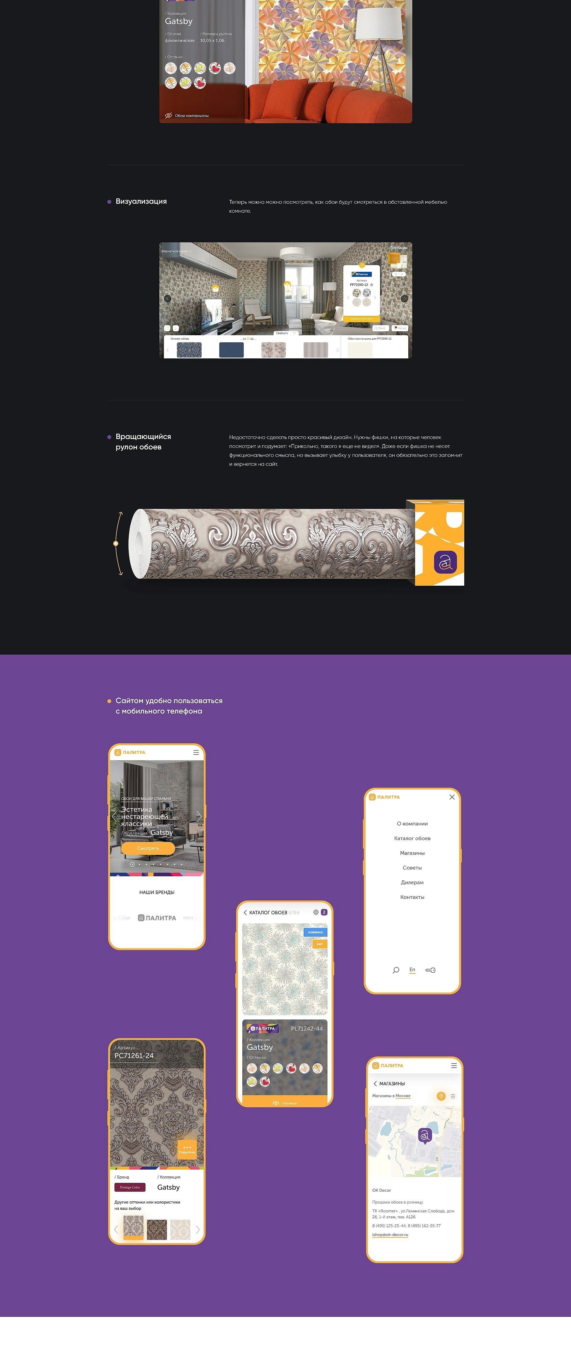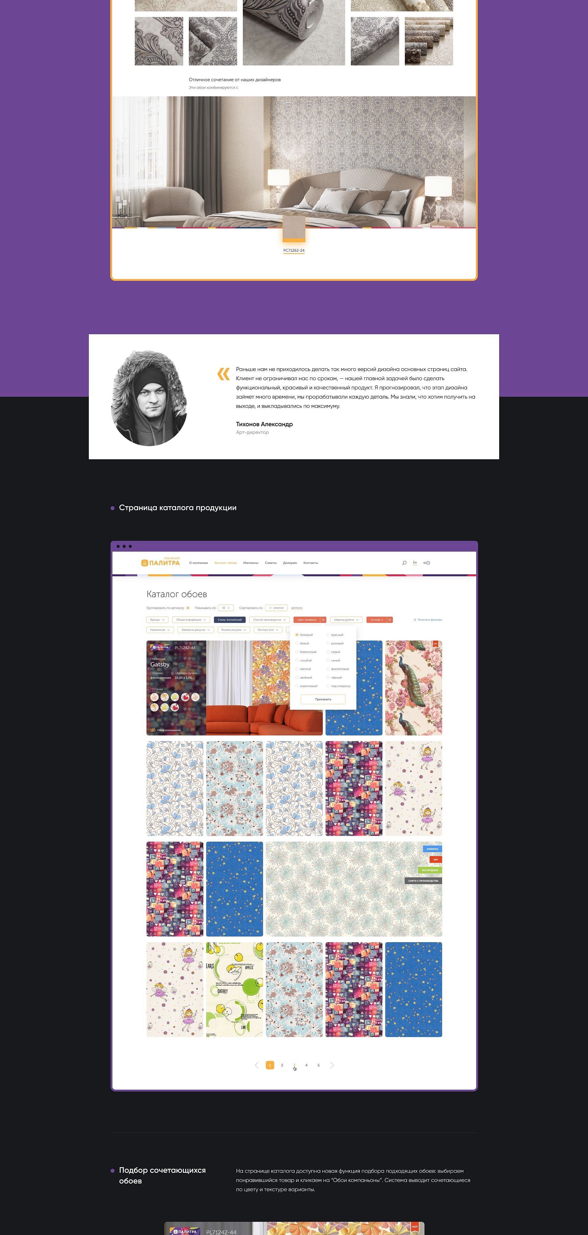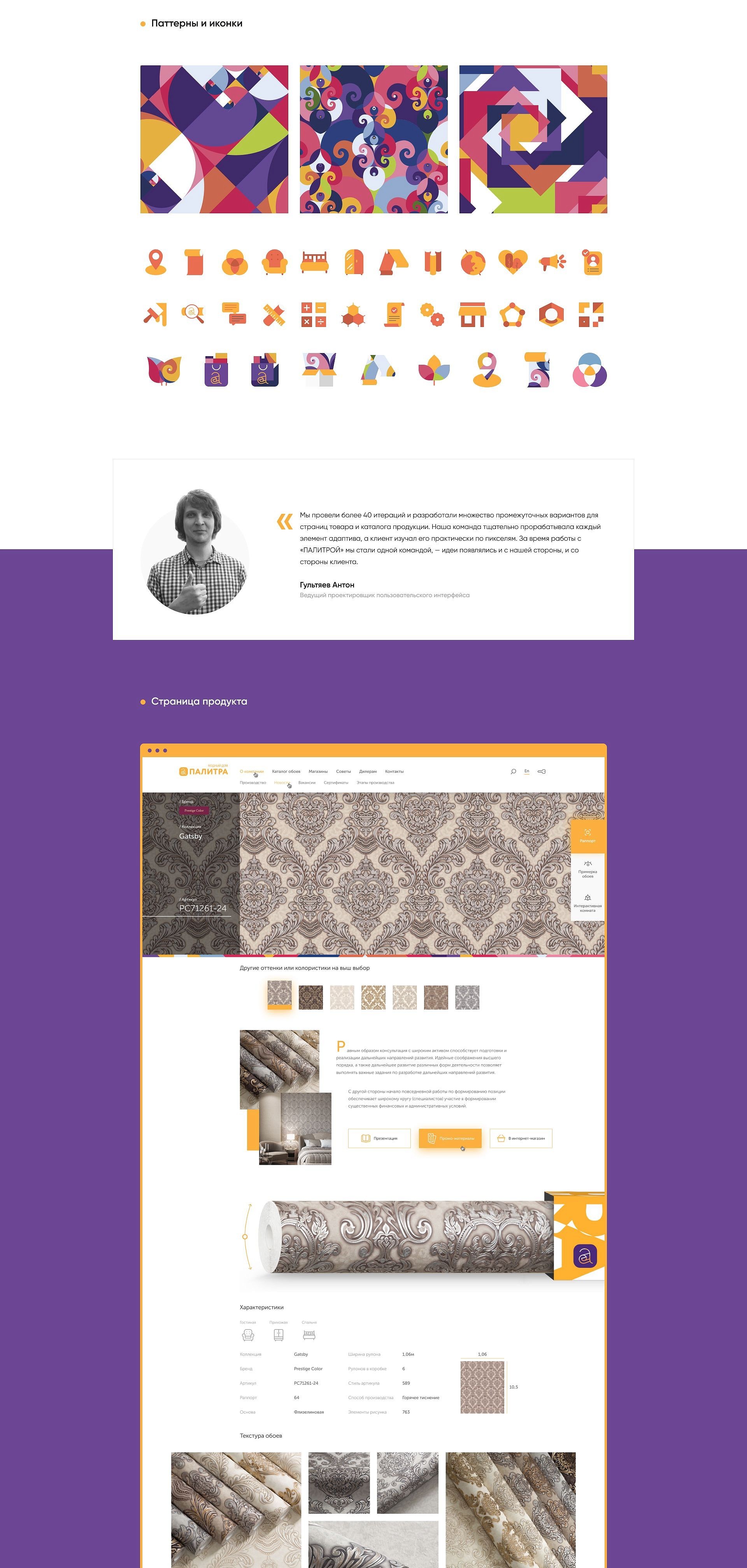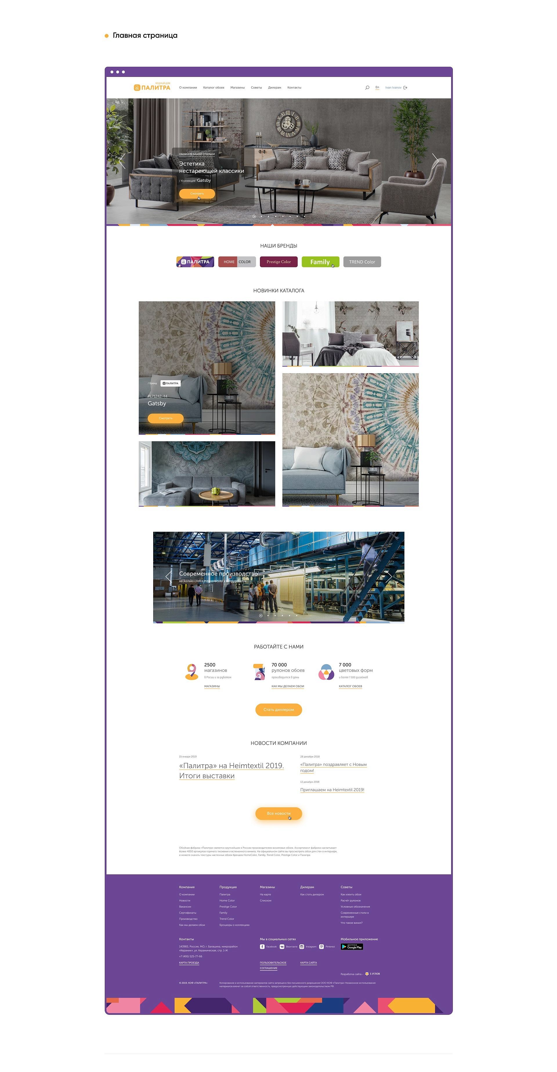 Обойная фабрика «ПАЛИТРА» производит и продает премиальные виниловые обои. Территория фабрики в Подмосковье занимает 70 гектар, — это площадь 10 футбольных полей. Фабрика существует с 2002 года, и с того момента существенных изменений на сайте не было. Заказчик сделал ребрендинг, но сайт остался в старом дизайне.