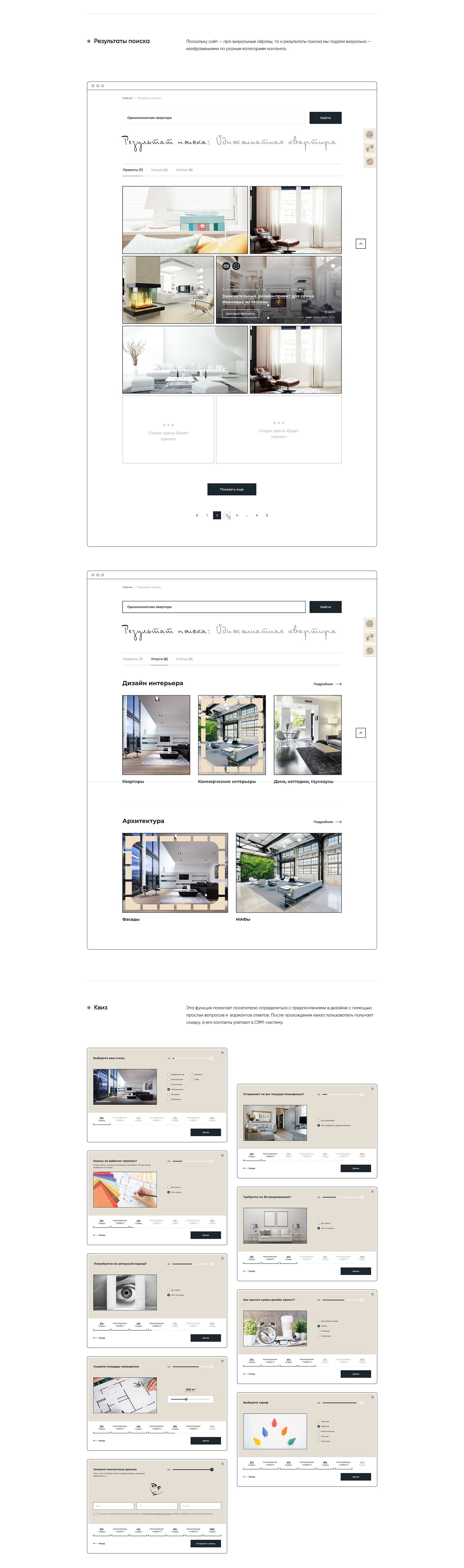 Задача была в том, чтобы пользователи сайта могли заказать ландшафтный дизайн или ремонт, дизайн интерьера для квартиры, офиса или частного дома. На сайте должно было появиться наглядное портфолио с умным фильтром и 3D-визуализациями, калькулятор стоимости услуг, который рассчитывает цену дизайн-проекта, квиз — опрос, отправляющий контакты пользователя в CRM-систему.