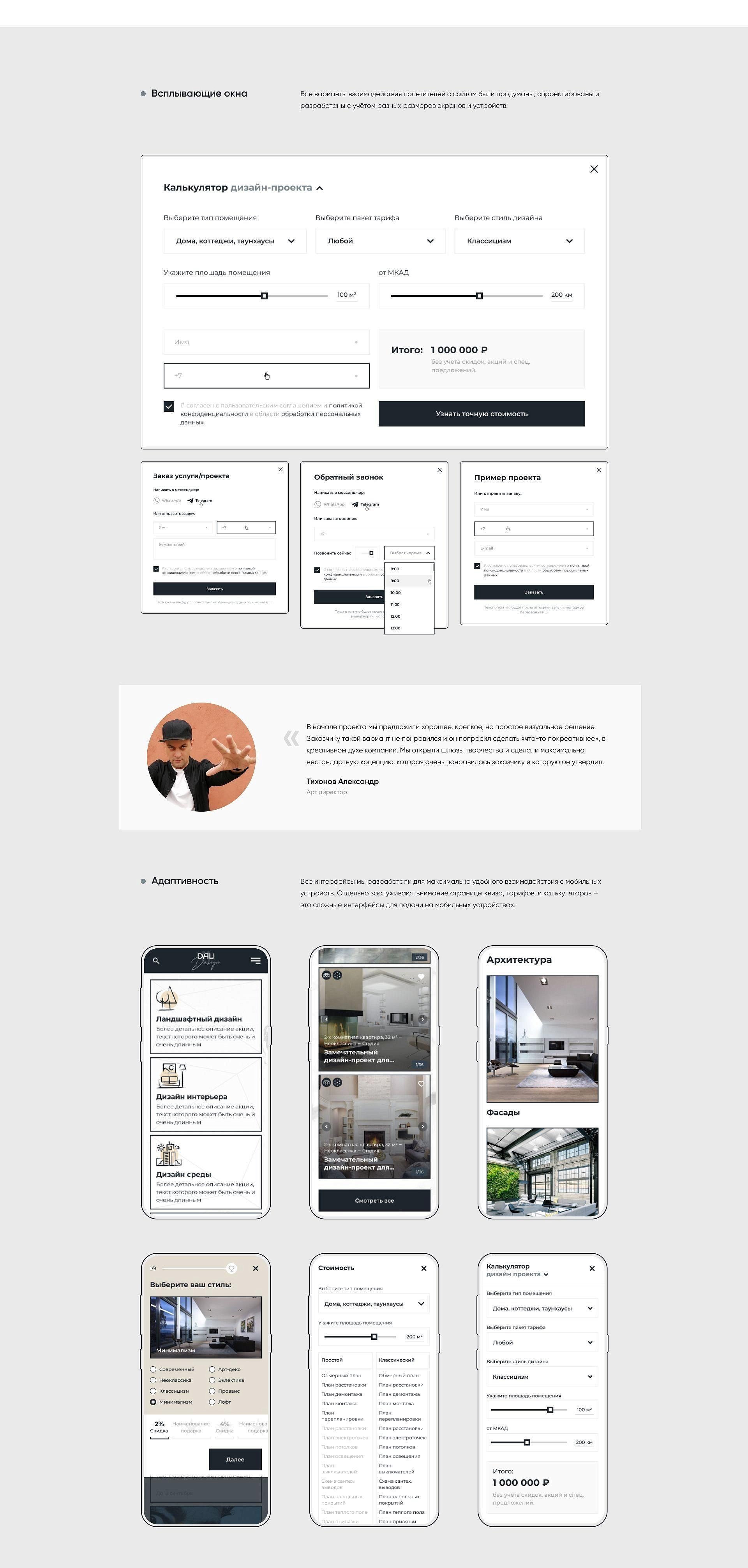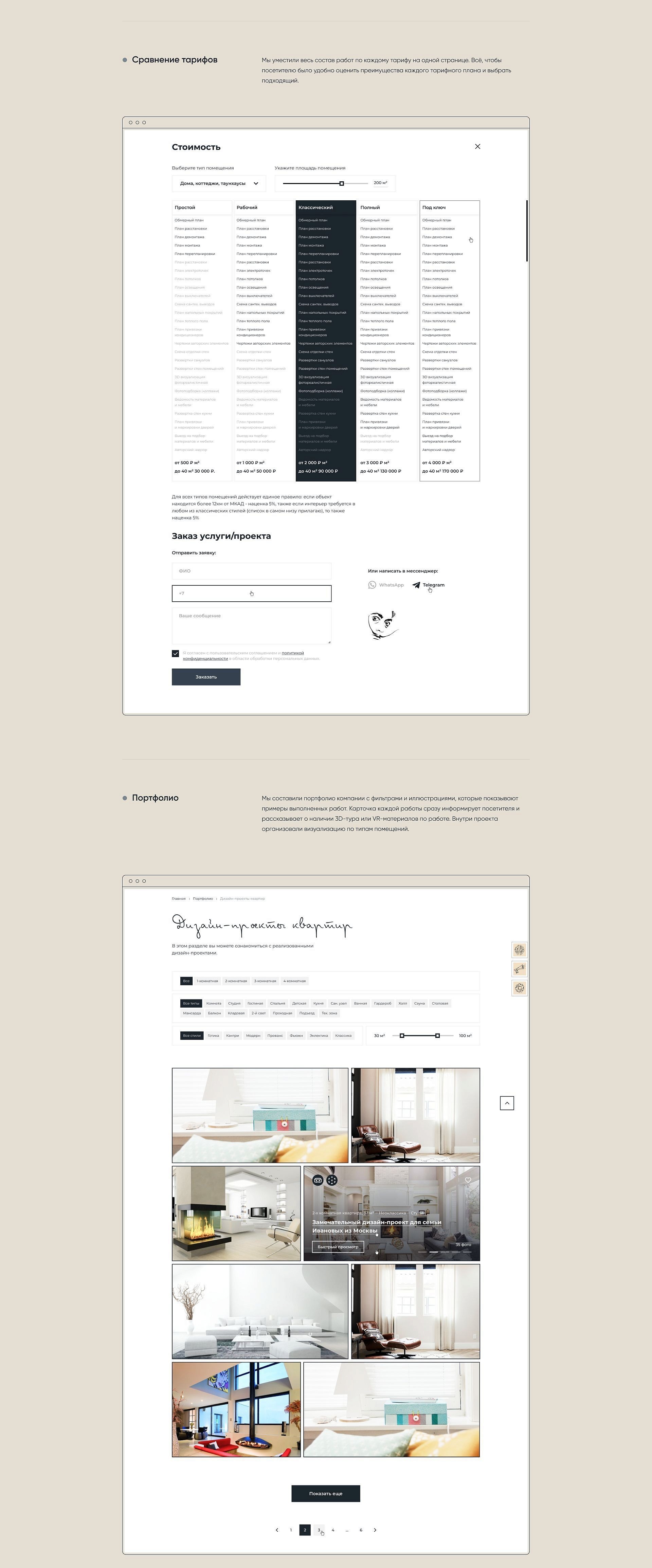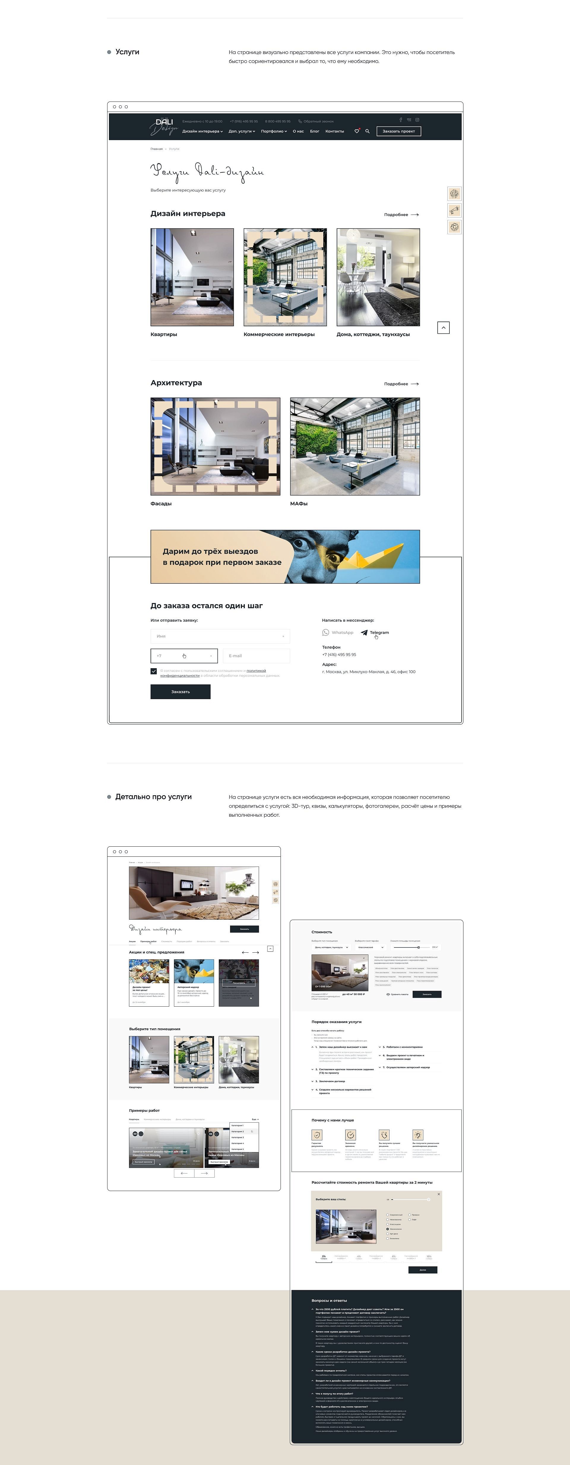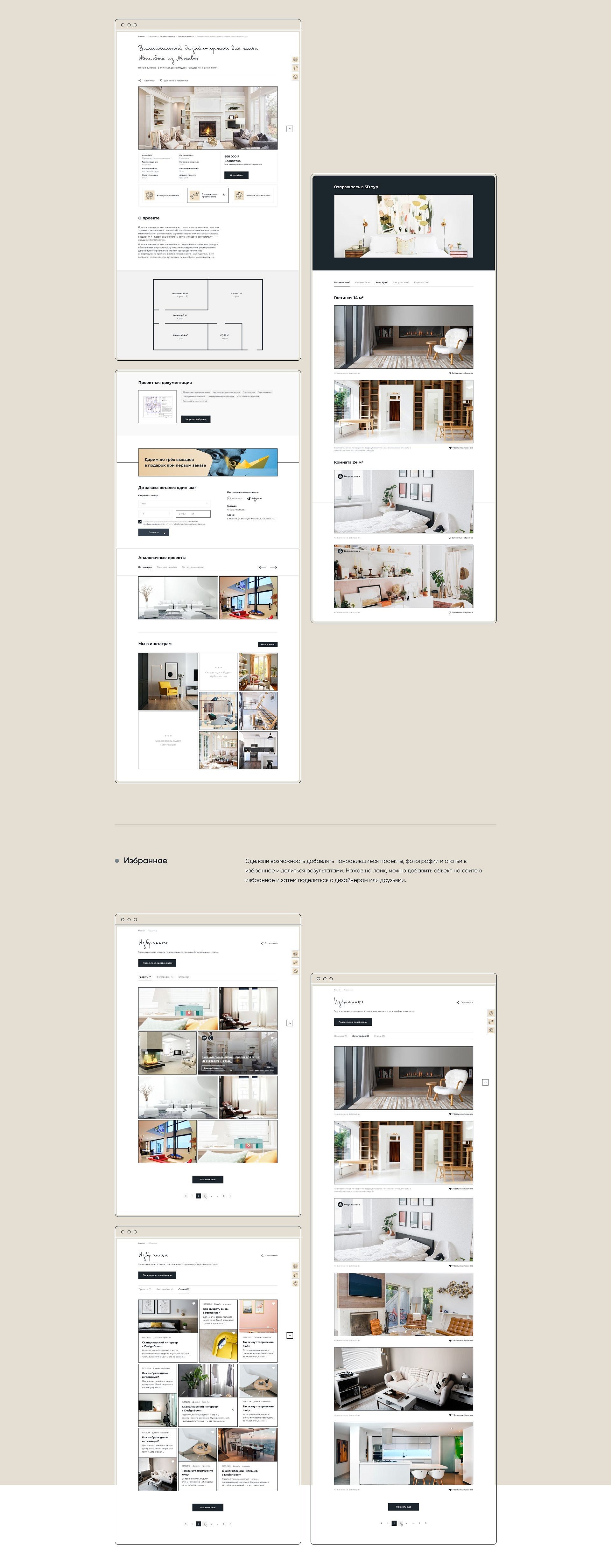 Изучили сайты конкурентов, сделали коллаж прототипов дизайна и адаптировали дизайн под разные устройства, придумали квиз и наглядную таблицу сравнения тарифов, реализовали раздел с избранным и возможностью поделиться понравившимся объектом, добавили блок с частыми вопросами, разработали калькулятор с формулой расчёта итоговой цены дизайн-проекта.