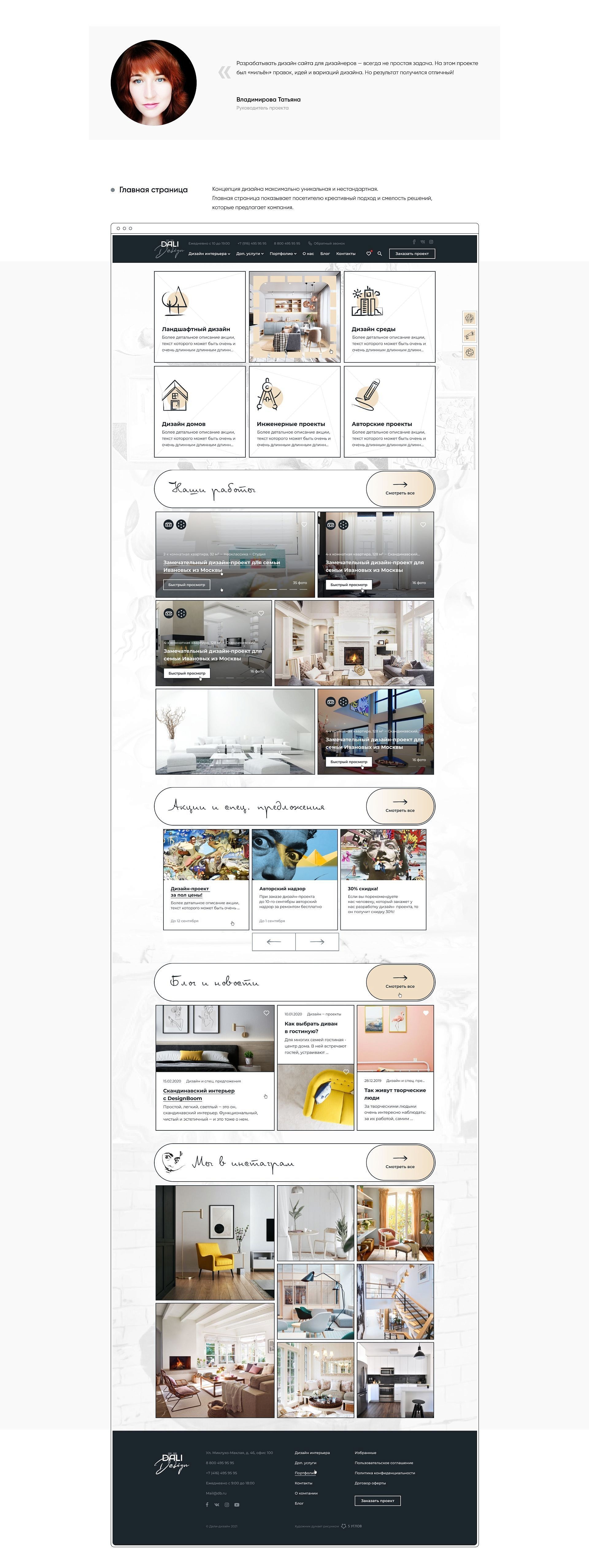 Дизайн-бюро Dali Design занимается проектированием и дизайном интерьеров. В списке услуг: ландшафтный дизайн, инженерия, архитектура, составление дизайн-проектов, декор, ремонт.