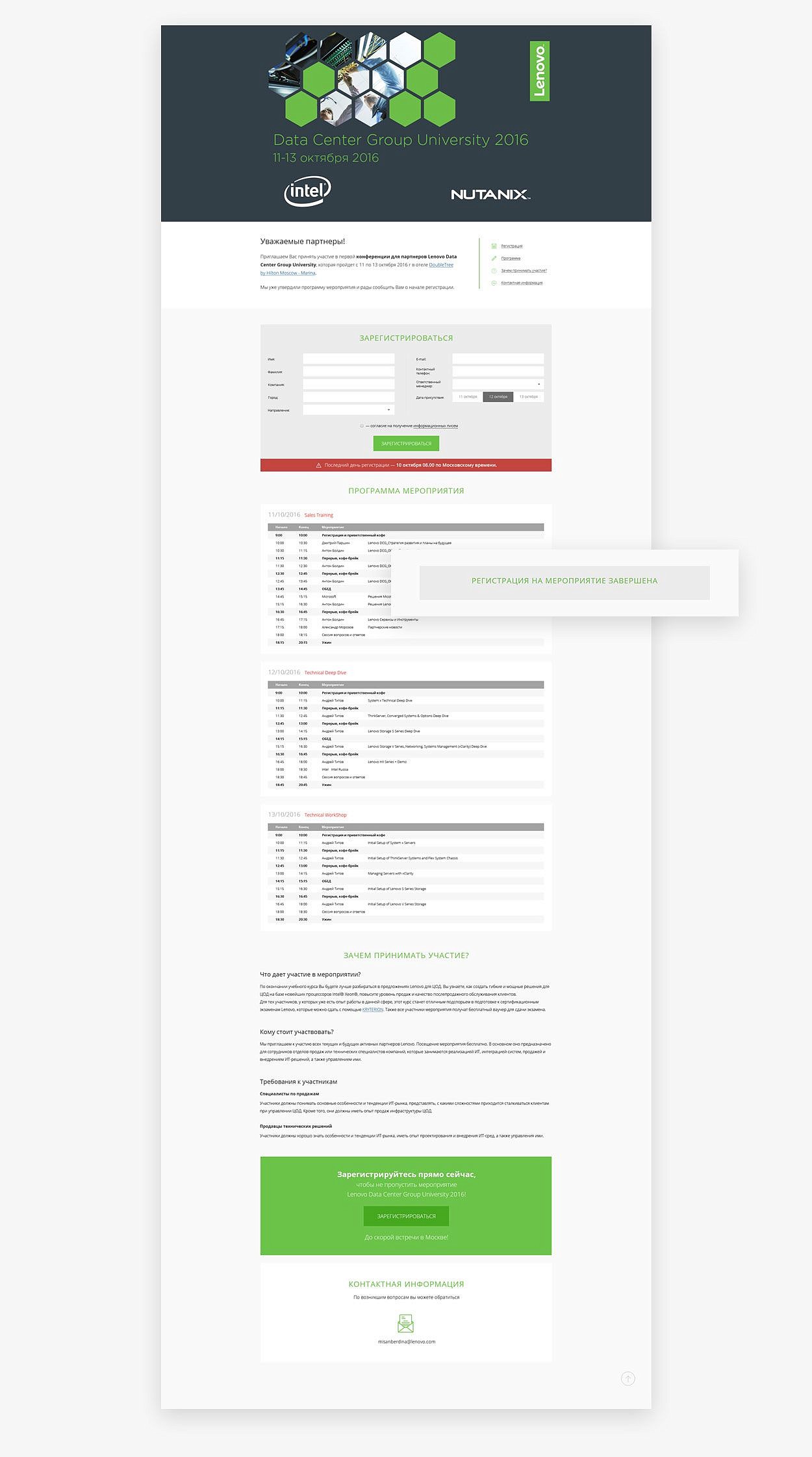 Разработать посадочную промо-страницу конференции для партнеров Lenovo Data Center Group University. Регистрация и СМС-уведомление партнеров, авторизация партнеров, автоматическая генерация пропуска на мероприятие, информация о событиях конференции.