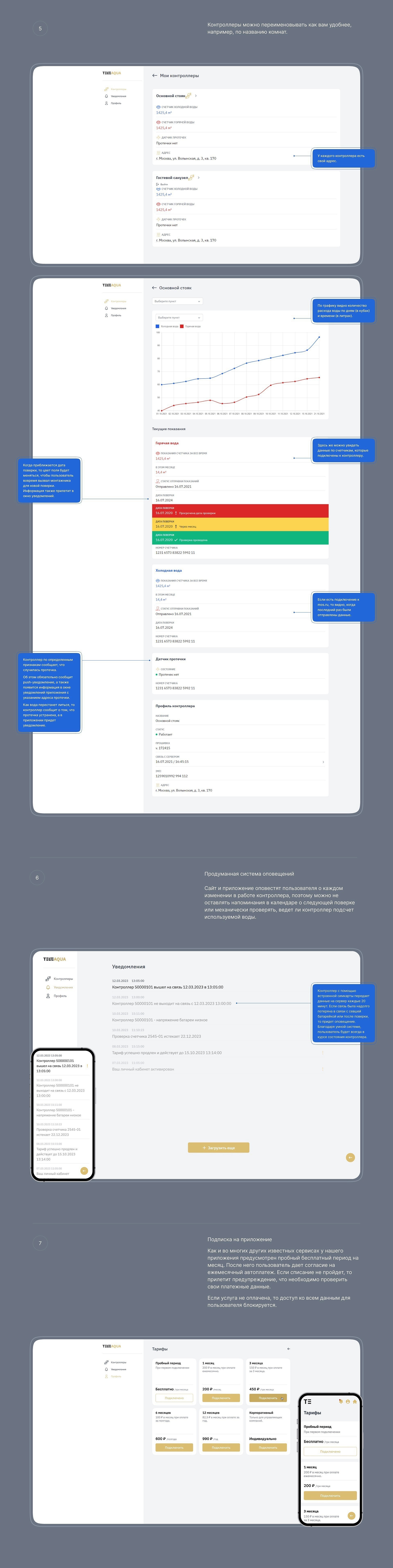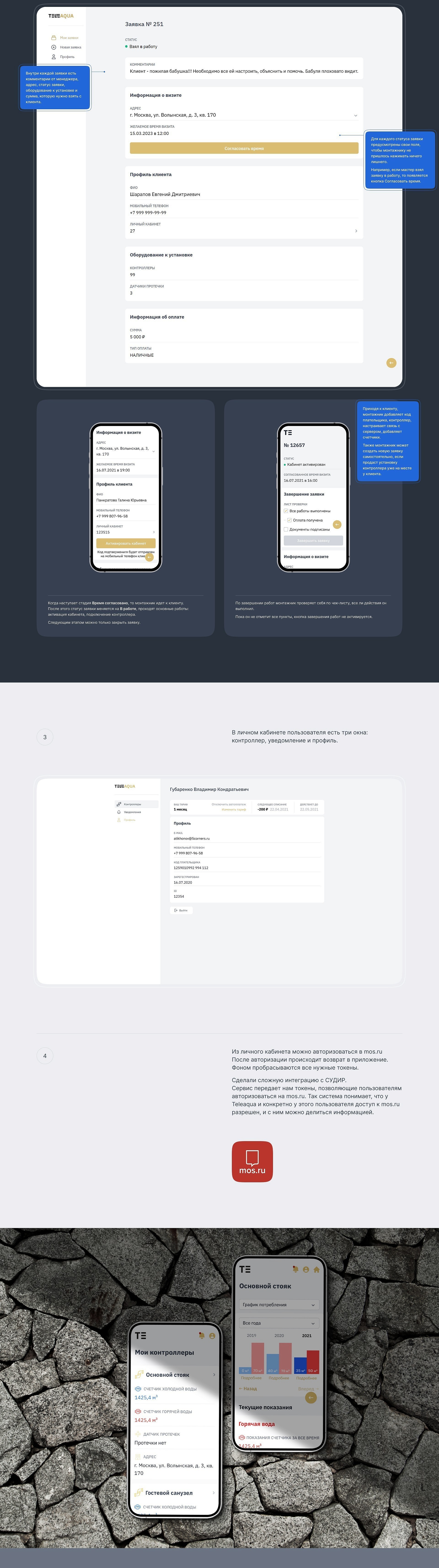 Сделали отдельный личный кабинет для монтажника и для обычного пользователя. Монтажник в своем кабинете работает с заявками, которые передает менеджер и согласовывает время выполнения работ. Владельцы контроллера отслеживают показатели по уровню расхода воды, как в цифрах, так и в виде графика, смотрят, нет ли протечек. Здесь же есть информация о последней поверке счетчиков и о том, переданы ли данные в mos.ru. Все это не только в личном кабинете на сайте, но и в мобильном приложении.