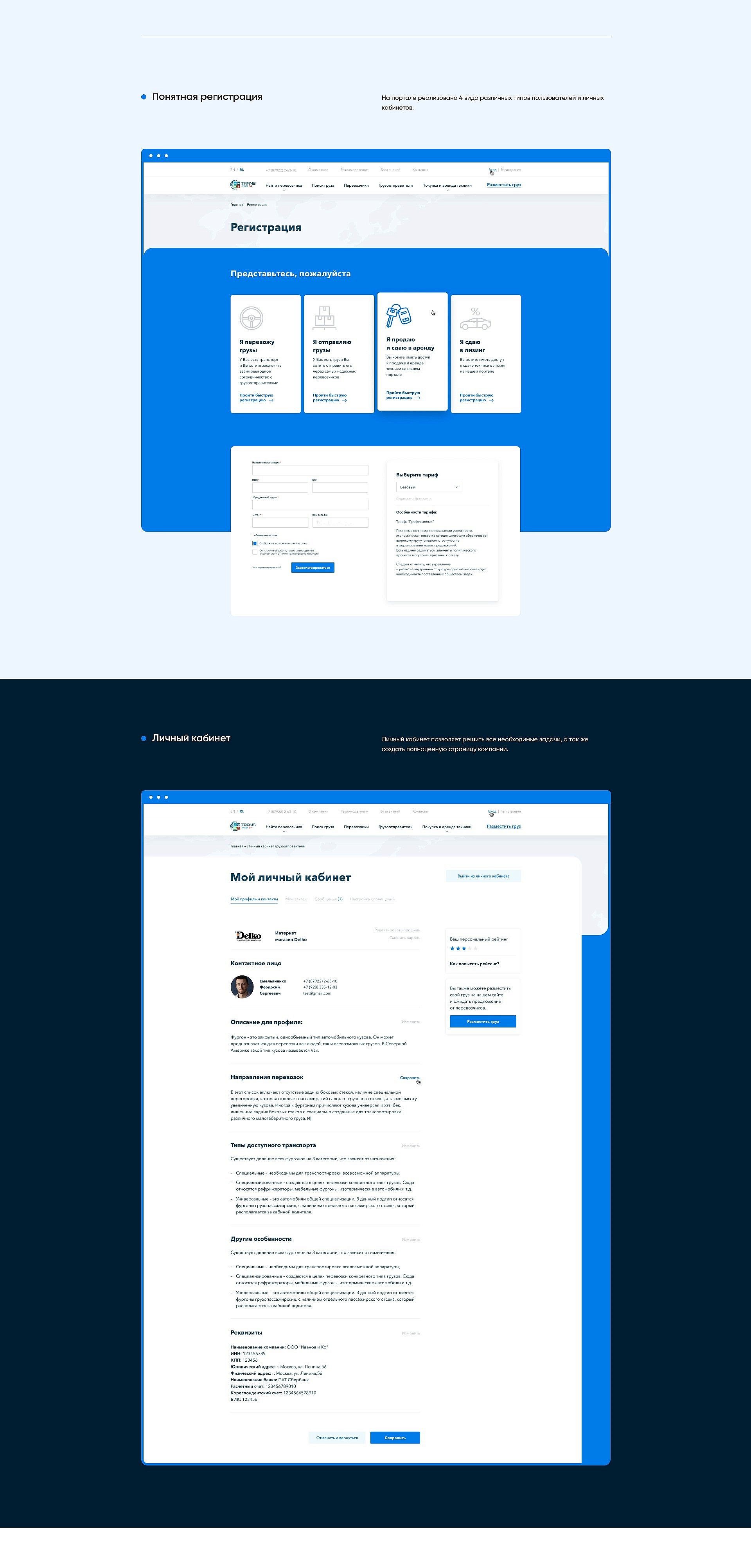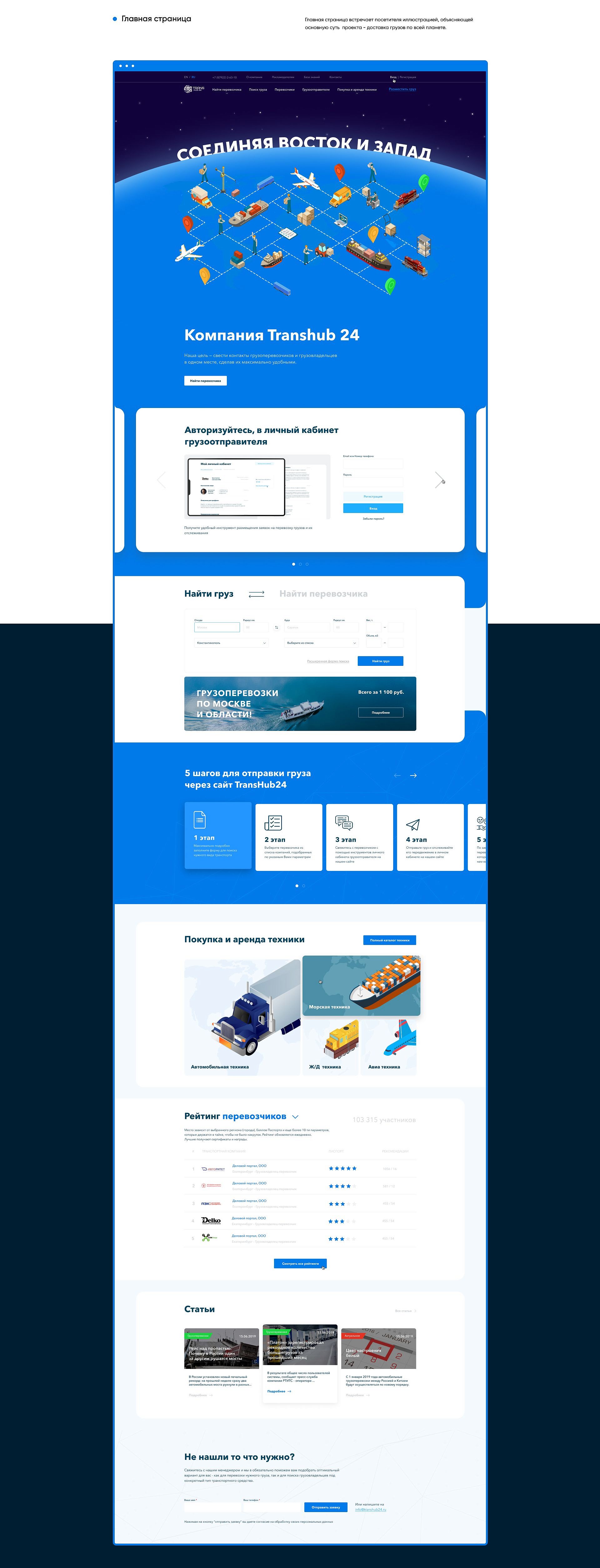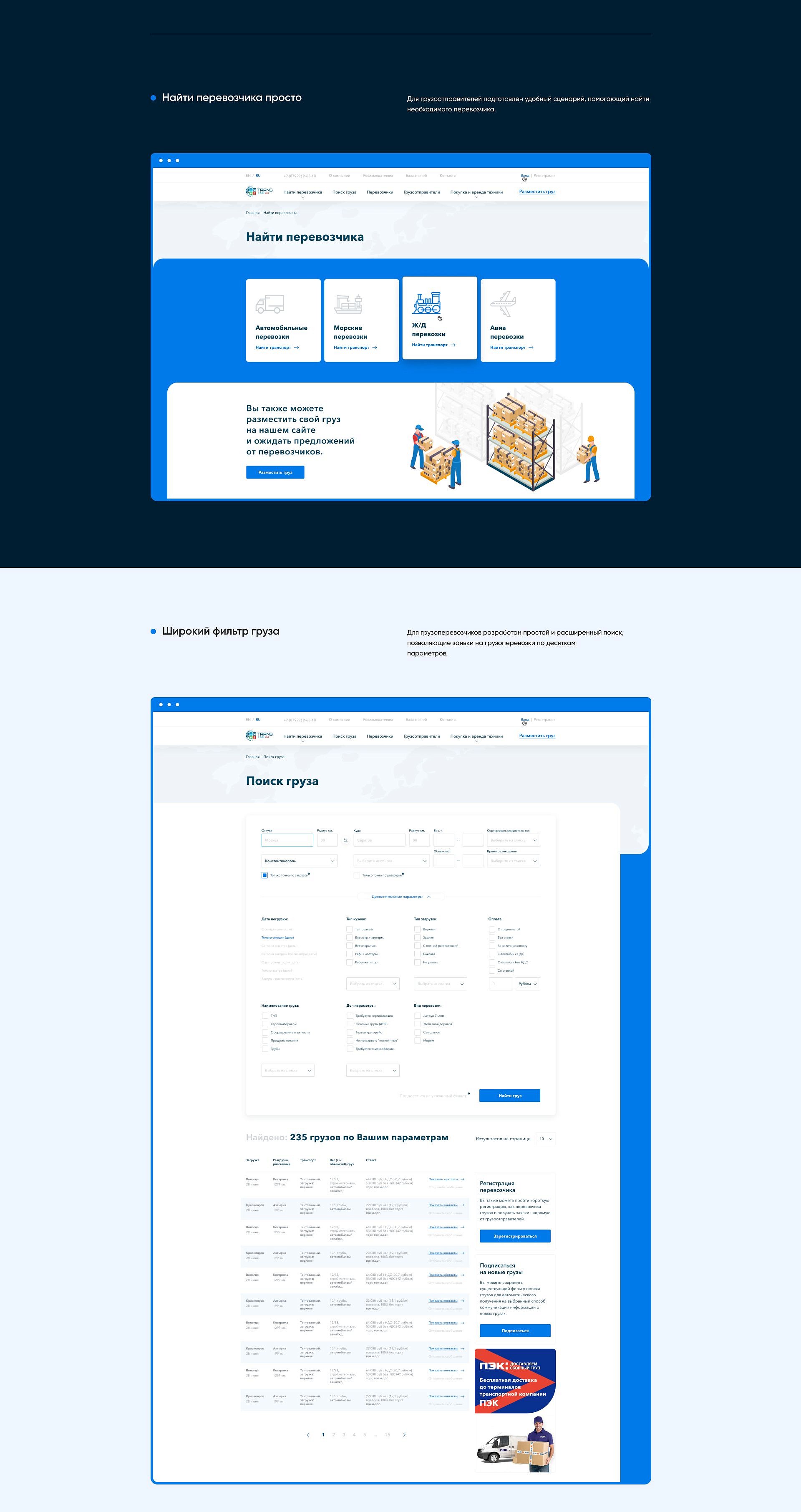 Клиент открывал новое направление бизнеса. Перед нами была поставлена основная цель создать современную полнофункциональную площадку для взаимодействия грузоотправителей и перевозчиков грузов. А так же площадку для взаимодействия между покупателями/арендаторами и их клиентами в части продажи/аренды/лизинга техники.